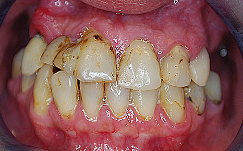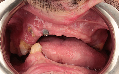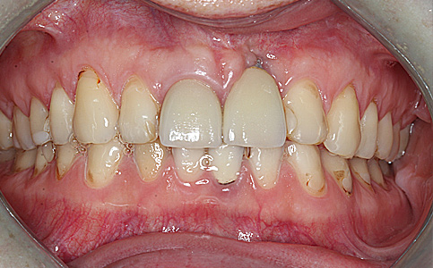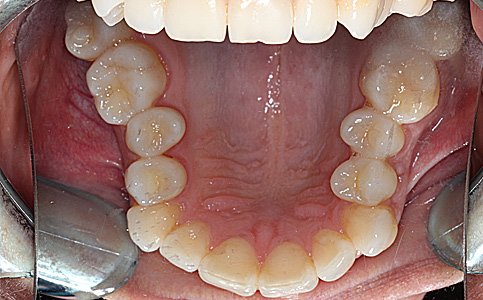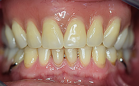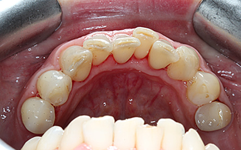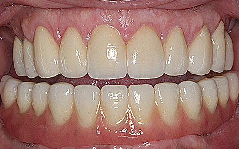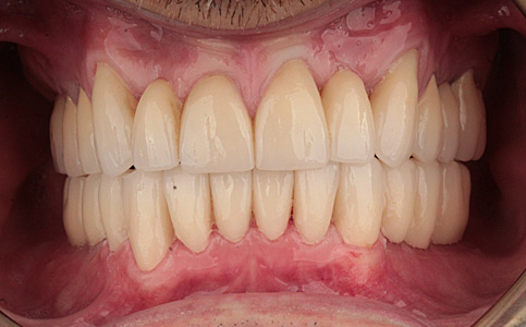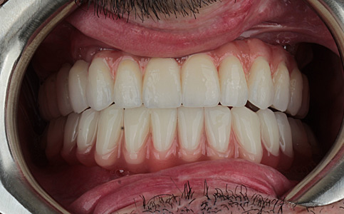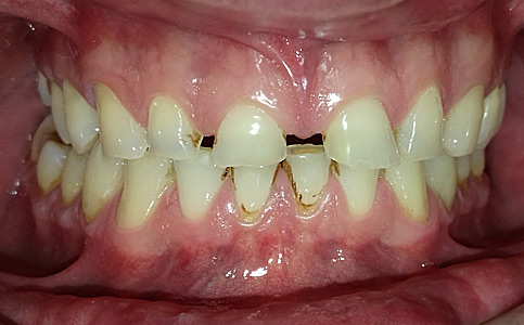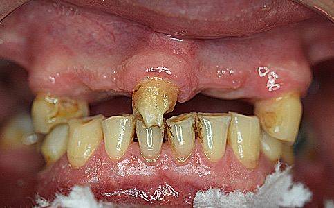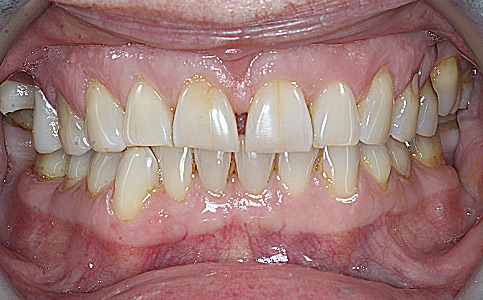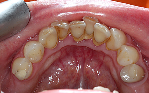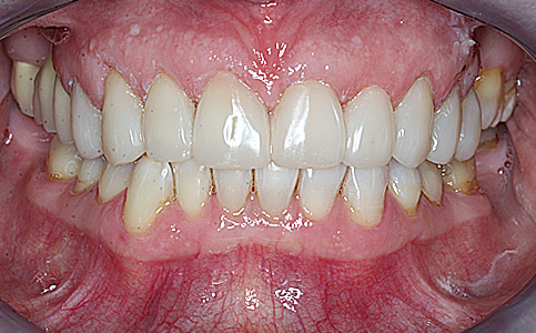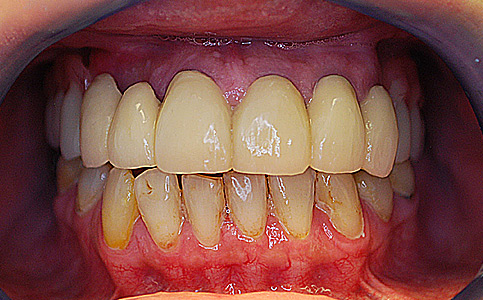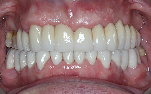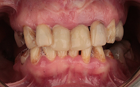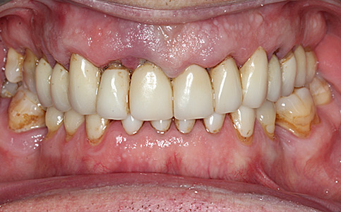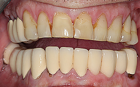 Po leczeniu próchnicy, usunięto korzenie zębów i wykonano pełną rehabilitacje zgryzu pracą protetyczną kombinowaną na koronach teleskopowych.