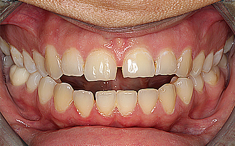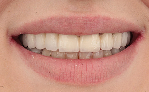 Leczenie ortodontyczne zgryzu otwartego aparatem DAMON. Po leczeniu ortodontycznym kosmetyczne dopasowanie kształtu koron siekaczy górnych.