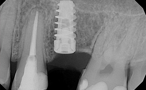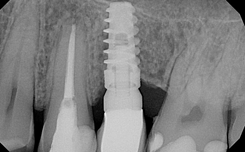 Przykład uzupełnienia pojedynczego braku zęba implantem. Implant imituje korzeń zęba, który w połączeniu z koroną protetyczną tworzy pełnowartościowy ząb.